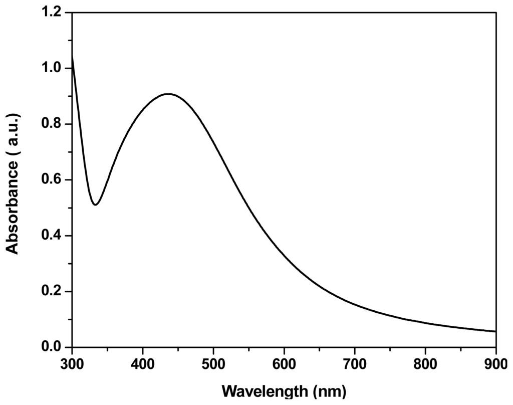 It is observed, from the spectra of Trichoderma viride synthesized silver nano solution, that the silver surface plasmon band occurs at 405 nm in addition to prominent band at around 260 nm []. Aspergillus flavus when challenged with silver nitrate solution a characteristic surface Plasmon absorption band at 420 nm was observed at 24 h that attained the maximum intensity after 72 h. After 72 h of incubation, no change in intensity at 420 nm was observed indicating complete reduction of silver ions []. The ultraviolet-visible spectra of Aspergillus terreus cell filtrate with AgNO3 showed a strong broad peak at 440 nm (SPR band), which indicated the presence of AgNPs []. Devi et al. [] screened 75 isolates belonged to 5 Trichoderma species for Ag NBs. Their results indicated that the high Plasmon band was observed at 420 nm at every 24 h.