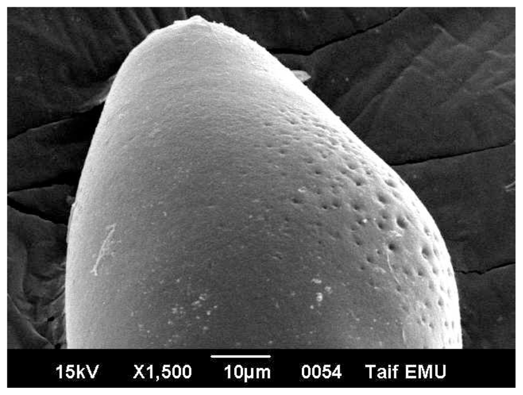 Egg of Fasciola is oval measuring 120 micron long and 40 micron wide. It has an operculum on its top. The egg is immature when first laid by the worm. Under electron microscope, the egg surface texture is smooth with no ornamentations (Figure 3). Electron micrographs of eggs representing the three patches are showed in Figures 3–5. Figure 3 shows non-treated control egg, notice the smooth texture of the egg shell and the non-distorted eggs. Figure 4 shows the egg treated with the drug alone, notice the partly distorted surface and rough texture of the egg surface. Figure 5 shows the egg treated with the drug with the silver nano particles, notice the more distorted surface and the perforations that are obviously shown on the egg surface.