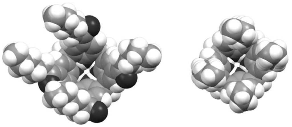 Encapsulation in the solid state of different guests within the host cavities of the para-acylcalix[]arenes has been previously reviewed by Coleman et al. []. The molecule preferentially assumes a cone conformation in the solid-state, with a cavity potentially available for inclusion. The carbonyl group of the acyl chain serves as an extension of the host cavity of the calix[]arene. The four carbonyl (C=O) groups fix the positions of the two first carbon atoms of each chain in the plane of the adjacent phenyl rings and thus control the cavity accessibility. Reduction of the carbonyl groups to methylene functions closes the cavity and prevents inclusion of guests as seen for para-hexylcalix[]arene (Figure 10) [].