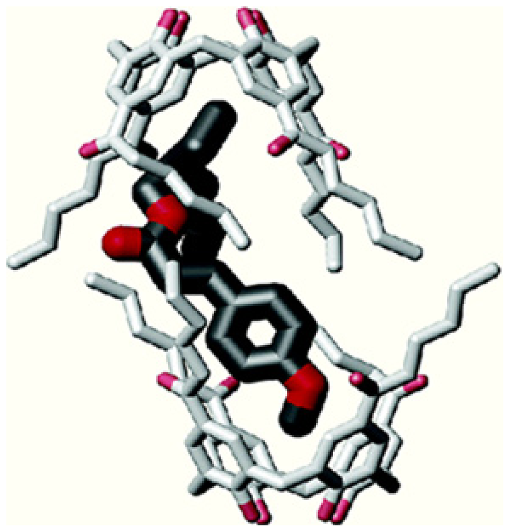 From solid state studies [–], the authors showed that the complex contains two molecules of para-hexanoylcalix[]arene enclosing one molecule of t-EHMC inside a nanocapsular structure (Figure 12).