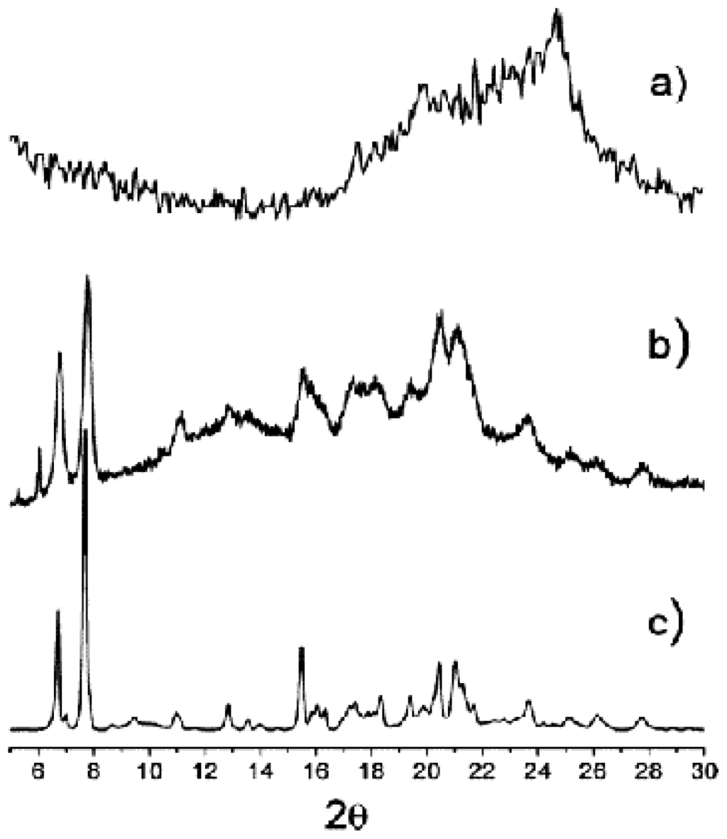 Powder XRD patterns of 2a SLNs: unloaded SLN (a); SLNEHMC-1.2 (b); and crystalline inclusion complex 2*2a.1t-EHMC (c) [].