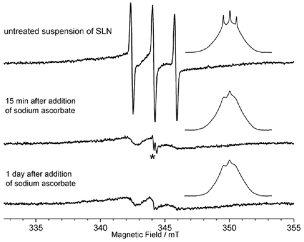 Electron spin resonance (ESR) spectra of SLN of 2a loaded with MT upon treatment by the solution of sodium ascorbate at room temperature in buffer solution of pH 7.4. Insets: integrated spectra. The asterisk denotes the ascorbate anion-radical [].