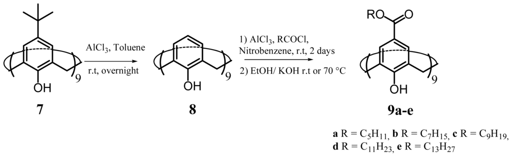The synthesis of 9a–e (Figure 16) has been achieved using the total substitution of para-tert-butylcalix[]arenes (7) []. It was noted that the complete removal of tert-butyl-groups in presence of aluminium trichloride as a Lewis acid using a modified standard method [] to yield calix[]arenes was the key step. The total para-acylation step was carried out under Friedel-Crafts conditions and the desired products were obtained after saponification of phenolic ester groups occurred in some cases [].
