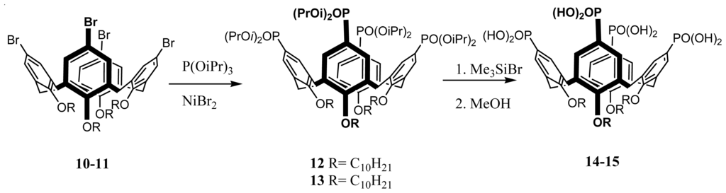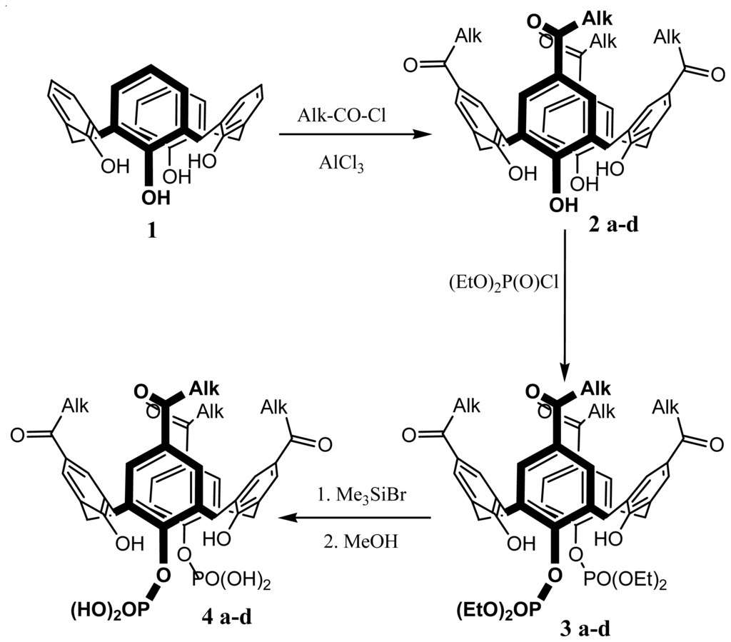 The synthesis and the modification of various para-acylcalix[]arenes has been reported by Shahgaldian et al. [] (Figure 2). Para-acylcalix[]arenes, 2a–d were obtained using a total acylation at the para position of calix[]arene, 1, via a Friedel-Crafts reaction in presence of different acyl chlorides and aluminium trichloride as the Lewis acid. The regioselective 1,3-diphosphorylation of the para-acylcalix[]arene, 3a–d gave after deprotection the 1,3-di-phosphoric acids, 4a–d in high yields.