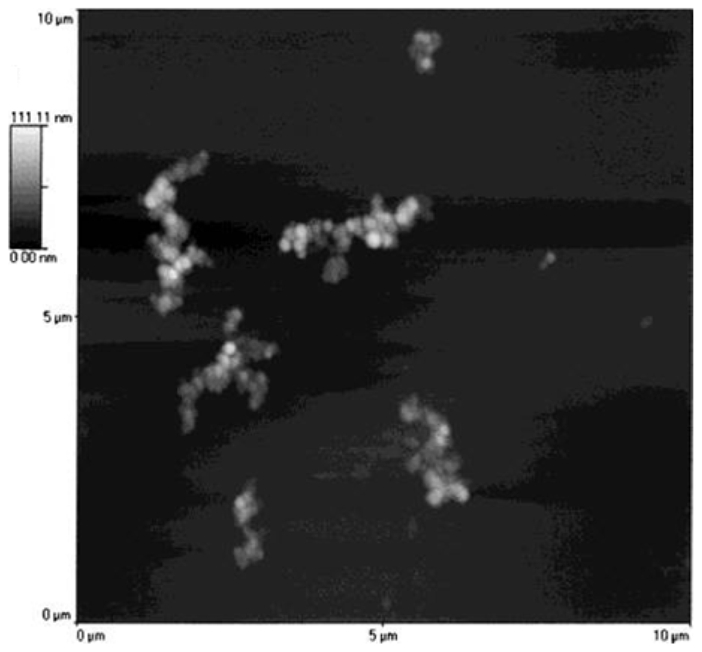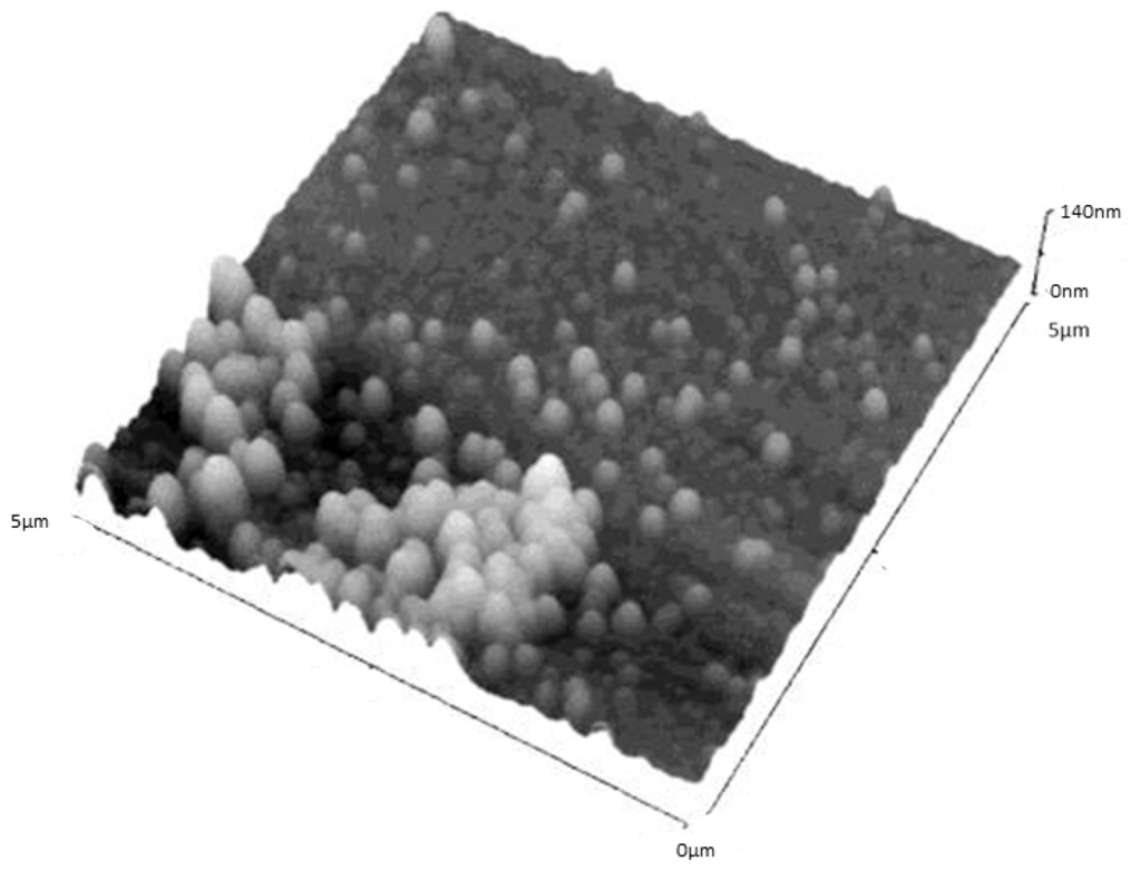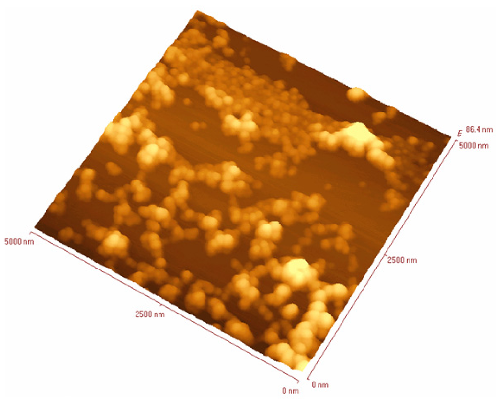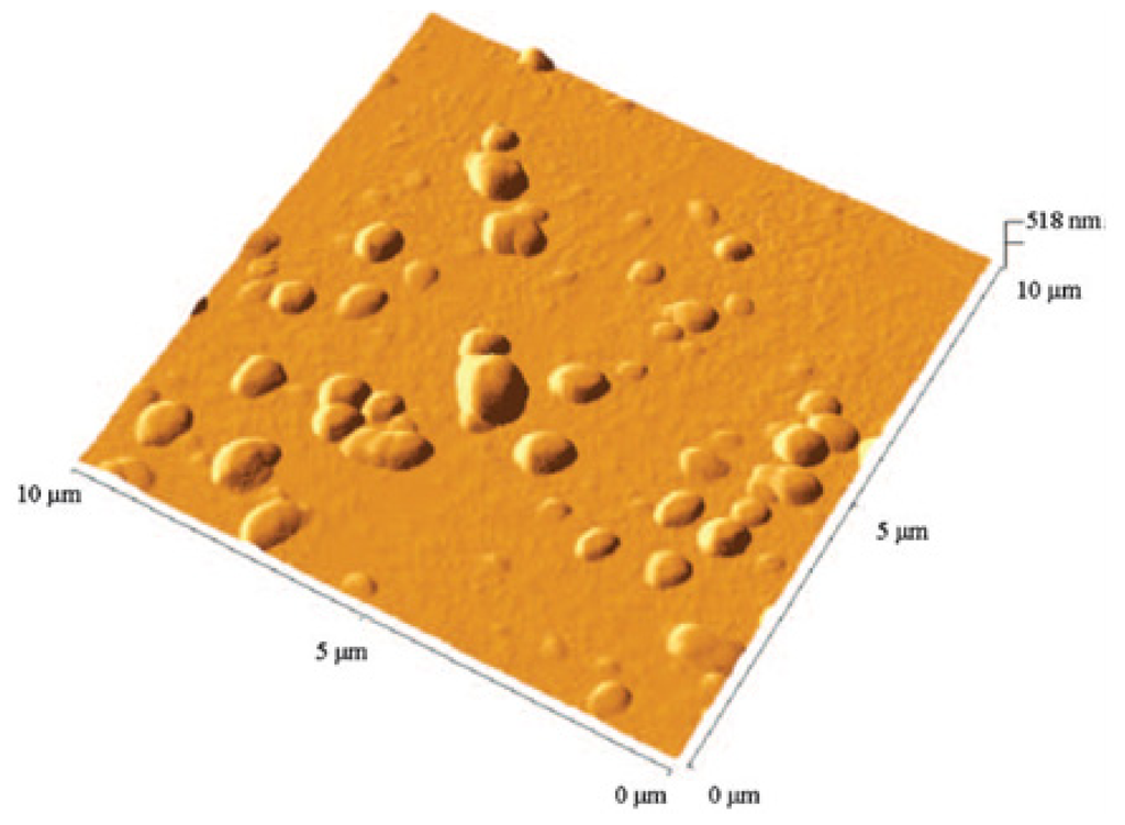 Non-contact mode atomic force microscopy (AFM) images of 2d-based SLNs reconstituted after freeze-drying in a solution of glucose (2%) at 5 mm scan range.