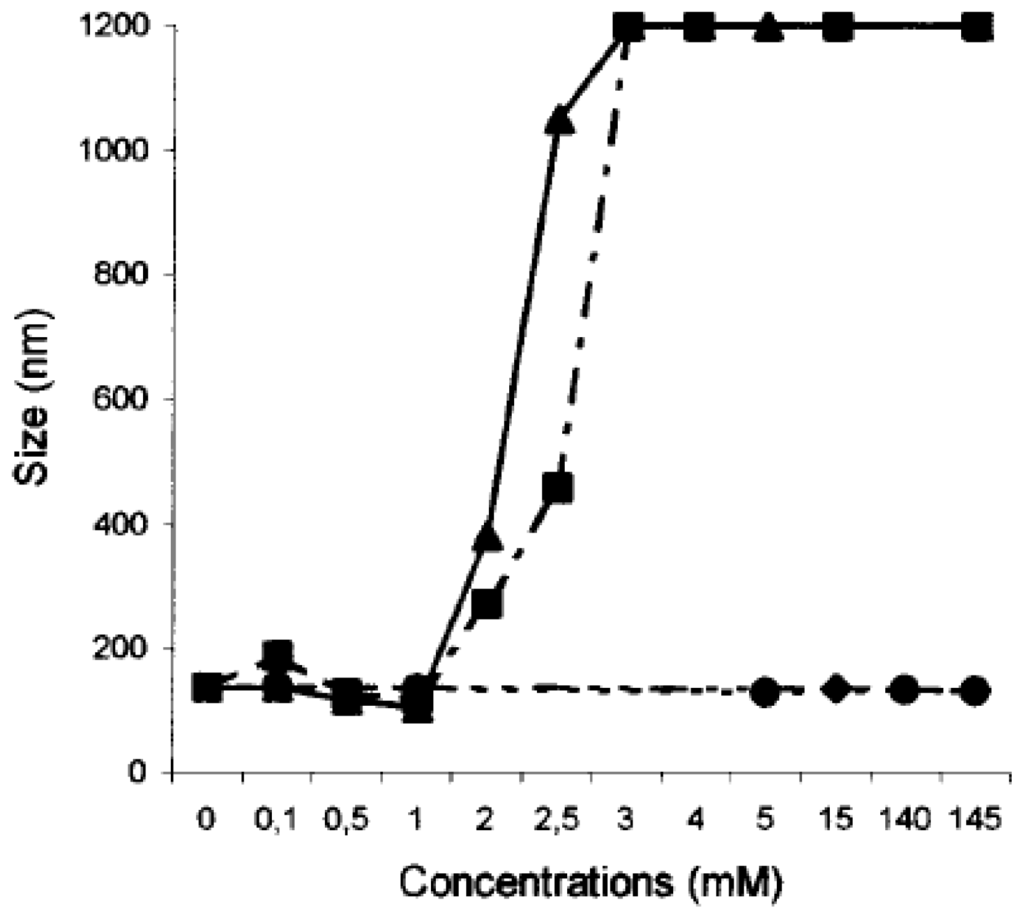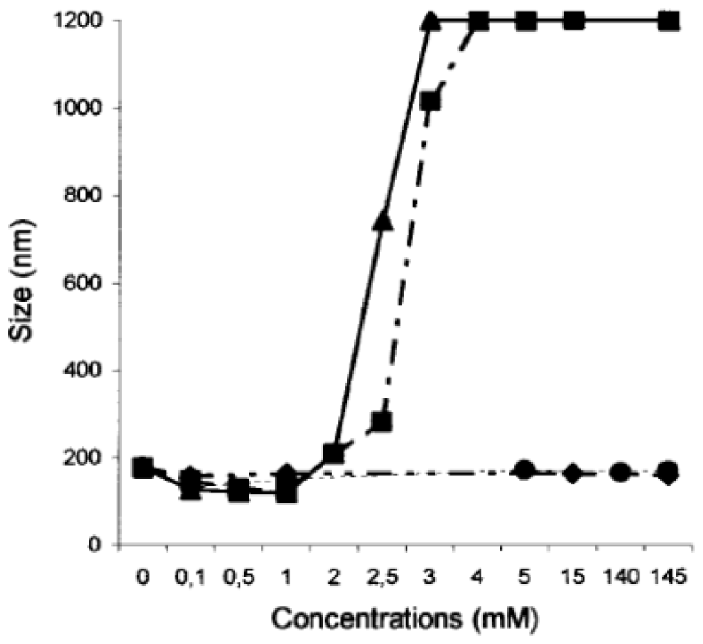 Firstly, the influence of various mono and divalent ions on the stability of the SLNs based on 9a was measured in presence of NaCl, KCl, MgCl2 and CaCl2. At time 0, no change in the particle size was observed except for KCl at 50 mM for which an increase in the size of 25% was seen. After 24 h, Mg2+ at 1 mM and Ca2+ at 2 mM caused an increase in the particle sizes and flocculation of the suspension occurred above these concentrations. Regarding the pH stability, it was observed that the SLNs based on 9a,e remain stable in the pH range from 3 to 12.