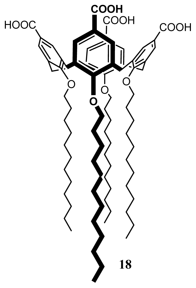 A second functionalization at the lower rim was also investigated using different anionic and nonionic groups [] such as carboxymethoxy (anionic), carboxypropoxy (anionic), 4-sulfonatobutoxy (anionic), ethoxycarboxymethoxy (nonionic), ethoxycarboxypropoxy (nonionic), 2-methoxyethoxy (nonionic) and 2-(2-methoxy)diethoxy (nonionic). The results reveal that certain compounds having a para-octanoyl substituent form stable monolayers and have strong tendency to self-organise into 3D structures at the air-water interface. However, whilst standard solvent diffusion methods were ineffective, these molecules self-disperse in water to yield dispersions of 260 nm diameter. The interactions between O-4-sulfonatobutoxy-para-octanoylcalix[]arene and a series of serum albumins have been studied by dynamic light scattering, and specific adsorption of this calix[]arene derivative onto the proteins was observed [].