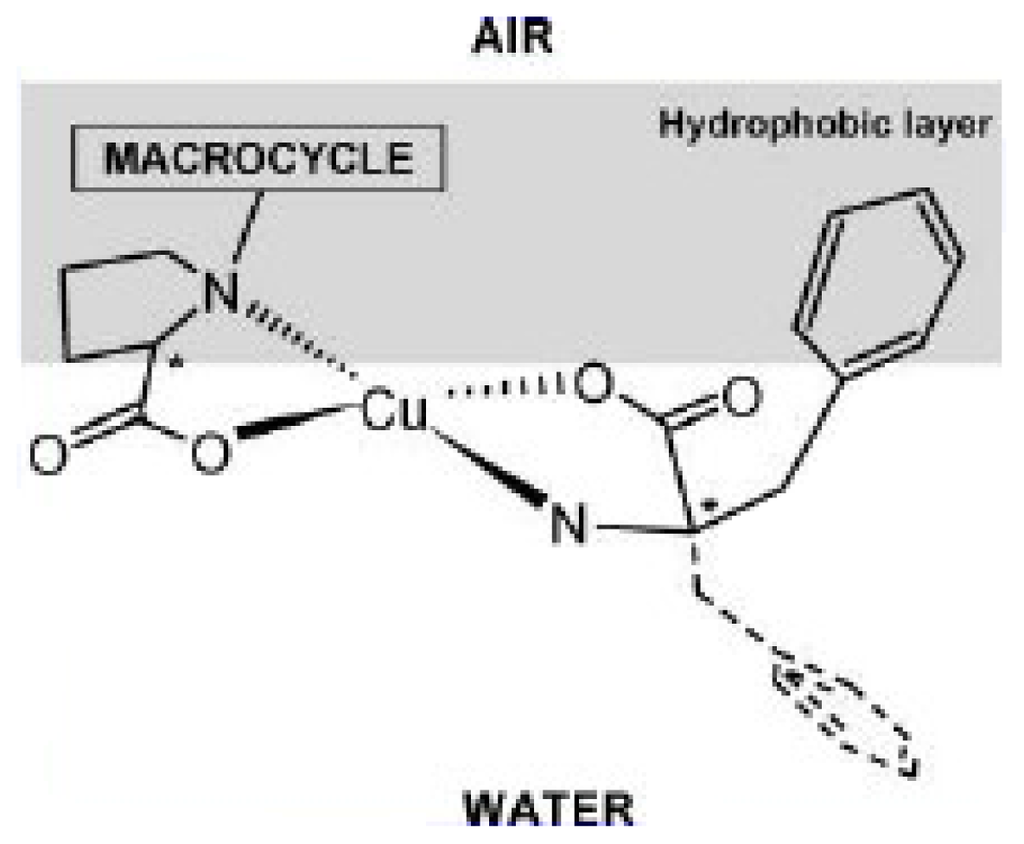 - Shahgaldian, P.; Pieles, U.; Hegner, M. Enantioselective recognition of phenylalanine by a chiral amphiphilic macrocycle at the air-water interface: A copper-mediated mechanism. Langmuir 2005, 21, 6503–6507. [Google Scholar]