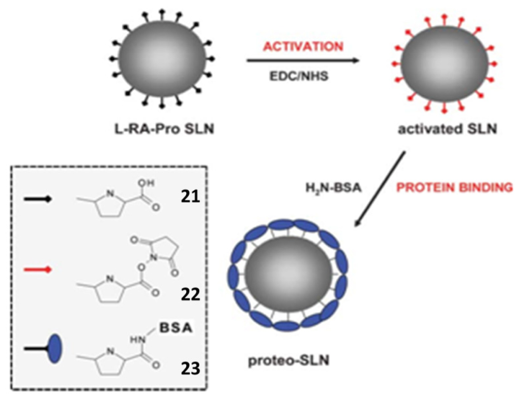 The interaction of the SLNs based on 9a with human serum albumin (HSA) was investigated to determine the initial possibility to use this kind of colloidal particles in the biomedical area. The SLNs suspension was diluted in aqueous solution of HSA in order to obtain a final concentration of HSA ranging from 1 to 40 g/L and analyzed using PCS []. The results revealed that the particle sizes increases when the concentration of HSA increases from 1 to 10 g/L, above this value, the particle size was invariant. HSA can form a capping layer as already observed in the case of polymeric nanoparticles []. The protein layer was estimated at 14 nm in depth, with either a single layer formed along the long axis or less probably by formation of a layer of four HSA molecules.