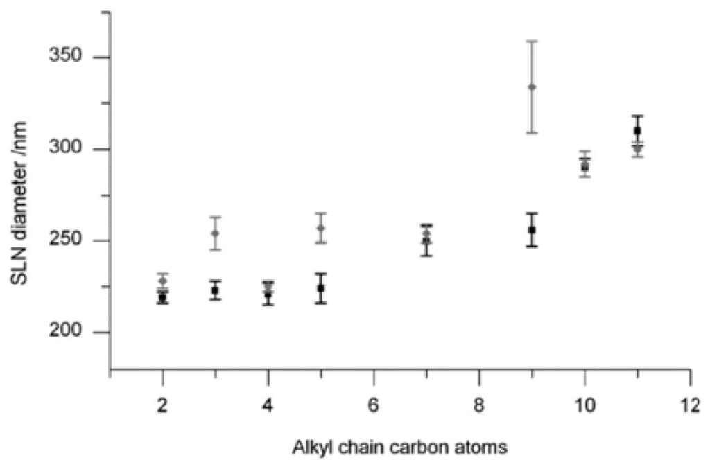 In terms of formulation optimization and stability parameters, different factors have been investigated by the group of Coleman []. The studies showed that no change was observed in the particle sizes for different acyl chain lengths of 2a–d (C6, C8, C10 and C12) when tetrahydrofuran (THF) was used as the organic phase. This result could be correlated with the crystal structures of 2a–d[]. Using different solvents as the organic phase such as acetone, THF, methanol and ethanol, the authors reported that no difference in term of particle sizes of the SLNs based on 2d in the case of ethanol and THF. However, a larger particle size was obtained when methanol and acetone were used as the organic phase. This result was attributed to the differences in the chain arrangement when interacting with certain solvents. Such behavior was later confirmed by X-ray crystallography for the chain folding as a function of the solvent of crystallization [].