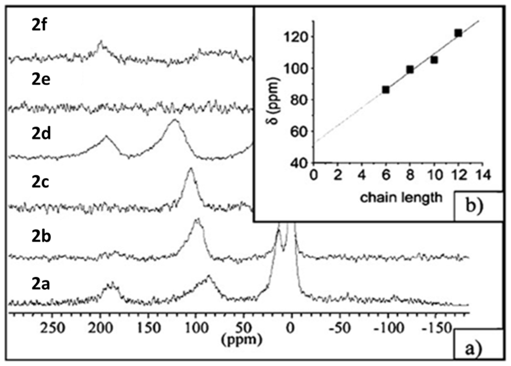 The increase of the shift of xenon interacting with the host cavity as a function of the number of carbons in the hydrophobic chains could be related to the reduction of void space for xenon in the host cavity. This relation between the shift and the chain length of the different para-acylcalix[]arenes is represented in the Figure 7b. An extrapolation to zero leads to a chemical shifts about 52 ppm, which is very close to the previously value obtained in the case of short chain corresponding to para-tert-butylcalix []arene (~60 ppm) [].