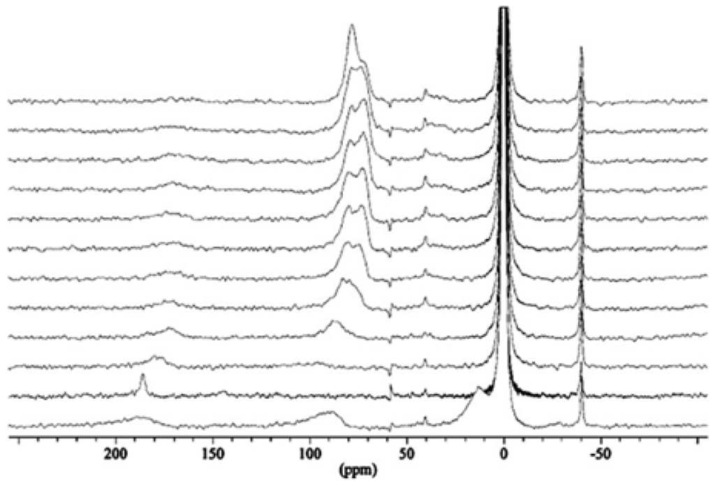 In situ transformation of 2a SLNs (bottom) after a pulse of methylene chloride (next to bottom) as monitored by continuous flow hyperpolarized 129Xe MAS NMR. Consecutive spectra were recorded every 4.5 min at room temperature. Sharp signals at ±40 ppm are spinning sidebands [].