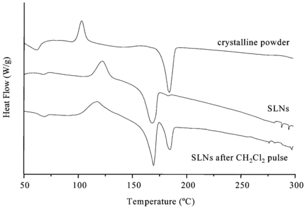 The purity of the lipids used can affect the zeta potential and therefore the stability of the SLN suspensions. For Intravenous (IV) administration of SLN suspensions they should be stable and toxicologically accepted []. In addition, the purity of the solid lipids used plays an important role in the oral administration of the SLNs. In fact, the release of active ingredients from the SLNs in the gastrointestinal tract (GIT) depends on the lipase/co-lipase activity for the GIT digestion of the lipid matrix. The lipase/co-lipase complex leads to a degradation of lipids before absorption []. Lipid crystallinity is correlated with the encapsulation efficiency and the release rate.