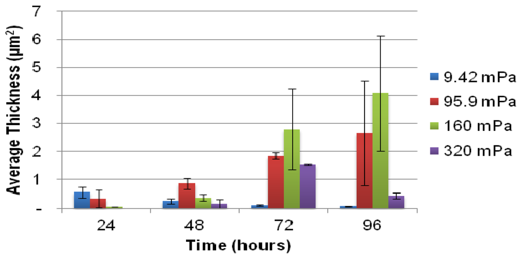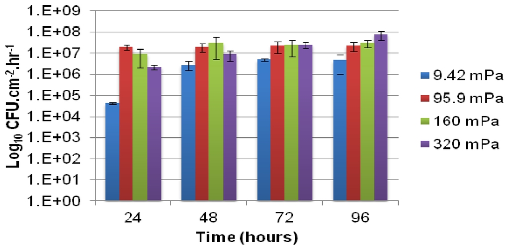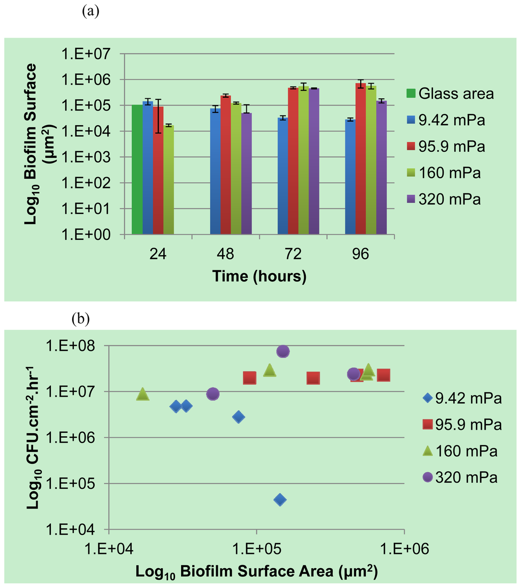 A selected number of the COMSTAT functions were used for the analysis of the biofilm: the biovolume of each image stack (μm3 μm−2), the mean thickness of the biofilm (μm) and the biofilm surface area-to-volume ratio (μm2 μm−3). The biofilm surface area (um2) (i.e., the area of the biofilm exposed to the bulk-liquid) was calculated using the results of COMSTAT analysis, by multiplying the biofilm biovolume (μm2 μm−3) by the xy attachment area (101,761 μm2), and the surface area-to-biovolume ratio (μm2 μm−3) for each Z-stack of images. The corresponding values obtained correlated well with the degree of biofilm development, as seen in the extent of substratum coverage and average biofilm thickness. The values were primarily utilized for qualitative purposes to identify potential relationships between the planktonic cell yield from biofilms and the different shear forces that they are subjected to.