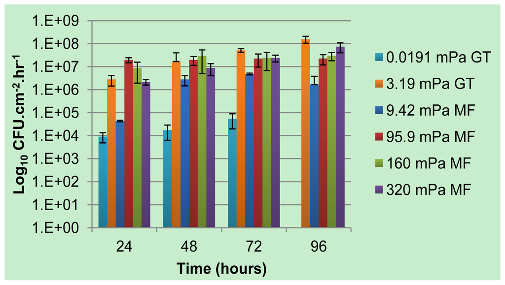 2), restricted the period of time during which biofilms could be subjected to high shear rates due to the large volumes of sterile growth media required. For example, a continuous flow rate of 450 mL h