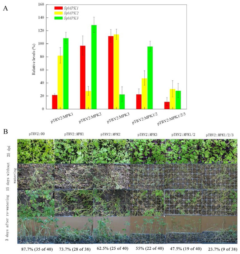 To examine the drought tolerance of plants that underwent individual gene silencing (SpMPK1, SpMPK2, or SpMPK3) and combined gene silencing (SpMPK1/SpMPK2 or SpMPK1/SpMPK2/SpMPK3), those containing <50% of the target gene transcripts were grown for an additional 15 days without watering, until most of the gene-silenced plants wilted. These plants were then re-watered for three days and their survival rates were compared. After re-watering, the individually gene-silenced plants showed lower survival rates—73.7% (28 of 38), 62.5% (25 of 40), and 55% (22 of 40) for plants with the silenced SpMPK1, SpMPK2, and SpMPK3 genes—respectively-compared with the control plants, whose survival rate was 87.5% (35 of 40). In contrast, plants with co-silenced SpMPK1/SpMPK2 genes had a survival rate of only 47.5% (19 of 40), while those with co-silenced SpMPK1/SpMPK2/SpMPK3 genes had a survival rate of only 23.7% (9 of 38) after re-watering.