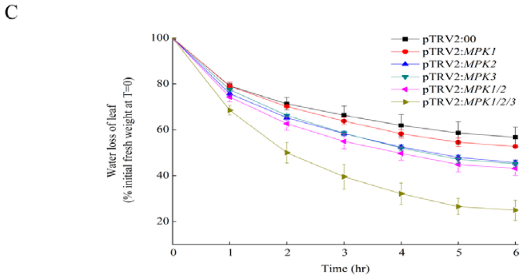 In conclusion, plants with individually silenced SpMPK1, SpMPK2, and SpMPK3 genes, as well as co-silenced SpMPK1/SpMPK2 and SpMPK1/SpMPK2/SpMPK3 genes, had lower survival rates than control plants when they were exposed to drought-like conditions. In addition, silencing these SpMPKs resulted in impaired stomatal closure and increased H2O2 production when plants were exposed to ABA. In conclusion, this study demonstrates that SpMPK1, SpMPK2, and SpMPK3 may play important roles in the drought tolerance of tomato plants. In drought tolerance, the functions of SpMPK1 and SpMPK2 may be redundant, and they may overlap with that of SpMPK3. Future studies will employ genetic transformation experiments to further explore how SpMPKs function in the drought tolerance of tomato plants.