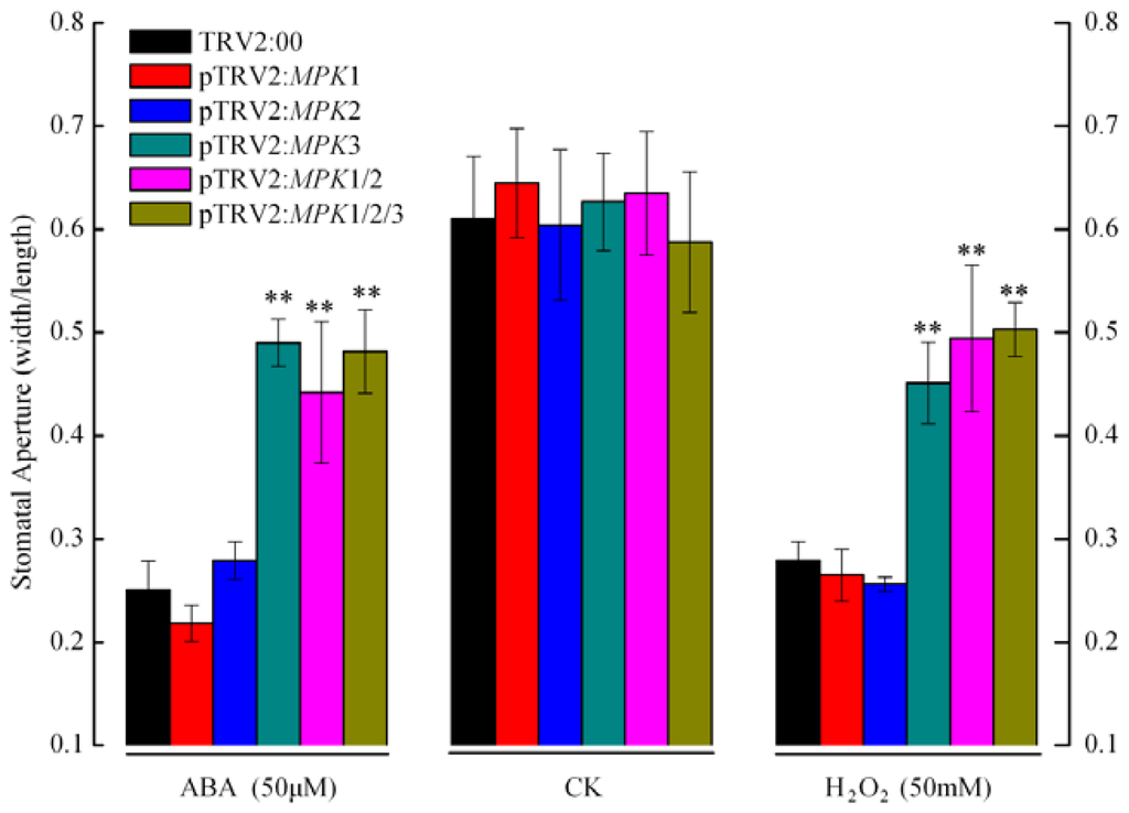 Stomata are pores formed by pairs of guard cells that are located in the epidermis. Plants can tolerate drought stress by regulating the aperture of the stomata to minimize water losses caused by transpiration. ABA-deficient plants or those with impaired ABA signaling are unable to adaptively regulate their stomatal apertures and are highly susceptible to drought stress [13,27,28]. To investigate whether SpMPK1, SpMPK2, and SpMPK3 genes function in ABA- and H2O2-sensitive stomatal responses, we examined the ABA-dependent stomatal activity in our gene-silenced plant models. Leaves from the control and experimental plants were submerged in stomatal opening solution and then treated with 50 μM ABA or 50 mM H2O2 for 2 h, and then stomatal apertures were measured. In the stomatal opening solution, all of the guard cells were fully opened prior to ABA and H2O2 exposure (Figure 2, CK). However, in the presence of ABA and H2O2, the control plants and the individually silenced SpMPK1 and SpMPK2 plants were highly sensitive to ABA and H2O2, which caused their stomata to close, as shown in Figure 2. In contrast, stomatal closure was markedly impaired in the leaves of SpMPK1/SpMPK2 co-silenced plants, as compared with that of the individual SpMPK1 and SPMPK2 silenced plants (p < 0.0001). These results suggest that SpMPK1 and SpMPK2 may redundantly regulate ABA- and H2O2-induced stomatal closure. In addition, individual SpMPK3 gene-silenced plants and SpMPK1/SpMPK2/SpMPK3 co-silenced plants exhibited the same stomatal behavior as SpMPK1/SpMPK2 co-silenced plants when exposed to ABA and H2O2. These results indicate that the function of SpMPK1 and SpMPK2 may overlap with that of SpMPK3 in regulating ABA- and H2O2-induced stomatal closure.