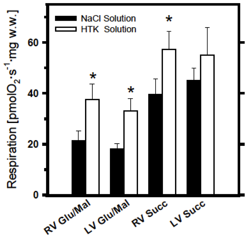 In our study we demonstrate that in controls, mitochondrial oxidative phosphorylation was similar in the left and right ventricle at the level of both mitochondrial complex I (with glutamate + malate), and complex II (with succinate). This can be important information since the usual strong requirements to use always very standardized biopsy samples regarding ventricle types may probably be avoided. Also, in controls (without cold ischemia), respiration data were not distinguished between the two solutions. Like previous findings using various heart cold ischemia models [21], 14 h of cold storage produced a decrease in mitochondrial function also in pig myocardium (up to about 60% of corresponding controls).