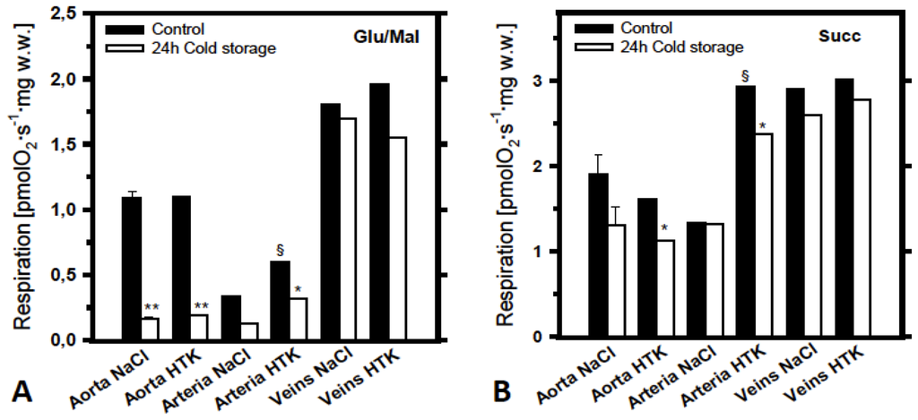 Respiratory activities of mitochondria in permeabilized aorta, arterial or venous fibers (cryopreserved in DMSO containing preservation solution, see reference [2]). Mitochondrial respiration of corresponding controls (without cold ischemia, filled bars) is compared with mitochondrial respiratory activities after 24 h cold storage (empty bars) in either saline NaCl solution or in Bretschneider’s histidine-tryptophan-ketoglutarate (HTK) preservation solution. As in Figure 1, respiration was measured at 30°C with glutamate + malate (A) or with succinate + rotenone (B) as mitochondrial substrates and expressed in pmols oxygen per second, per mg wet weight. *: p < 0.05 and **: p < 0.01 as compared with controls; §: p < 0.05 as compared with corresponding saline NaCl groups.