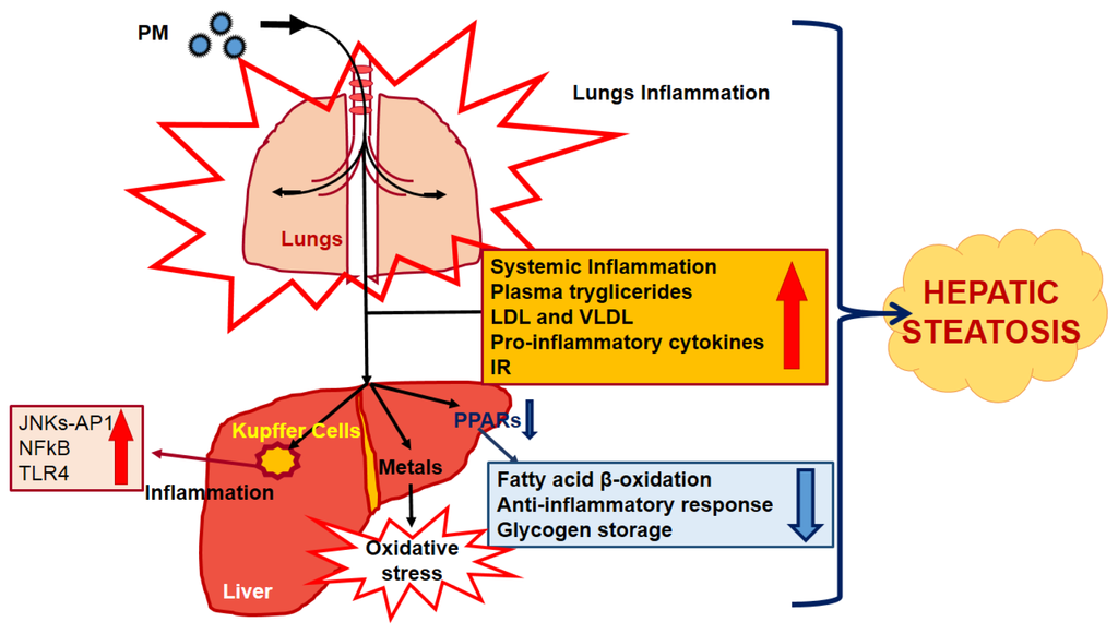 The diameter of particles, measured in micrometers (μm), is a crucial aerodynamic feature because affects their deposition and clearance by the respiratory system. In fact, particles smaller than 10 μm (i.e., those called PM10), are defined as inhalable. In the 1990s, it was suggested that the smallest ones—those less than 2.5 μm (PM2.5), mainly constituted by organic and elemental carbon, sulfates and nitrates []—are the main agents affecting human health, because they can reach the lung alveoli []. Based on this, scientific research has always been focused on the effects of air pollution on the respiratory system; whereas, only limited data exist about the potential role of pollution on liver. In recent years, the pathogenesis of cardiovascular diseases (CVDs) and MeS were strictly linked to the exposure to PM2.5 [,,,], indicating its deep metabolic impact. PM2.5 promotes systemic and pulmonary inflammation, prompting IR occurrence (Figure 1) [,,]. It was recently demonstrated that PM2.5 exposure may synergistically act with a high-fat diet in promoting MeS [,], an event associated to inflammation onset that may represent a main risk factor in NAFLD progression []. Accordingly, mice exposed to the “real-world” PM2.5 for 10 weeks, showed inflammation, hepatic lipid accumulation, increased plasma triglycerides (TGs) and low/very low-density lipoproteins (LDL/VLDL), IR and reduced hepatic glycogen storage, with the latter representing compelling signs of an altered glucose metabolism (Figure 1) []. Zheng and colleagues demonstrated that a “short” exposure (3 weeks) to PM2.5 causes only a low grade lung and liver inflammation, reflecting the increase in pro-inflammatory cytokines in the plasma []. Nonetheless, when the exposure is prolonged to 10 weeks and PM2.5 particles reached the liver, they cause hepatic Kupffer cell activation, inducing an inflammatory response (Figure 1) [,,]. This mechanism was seen to be mediated through c-Jun N-terminal Kinases (JNKs)-activator protein 1 (AP1), nuclear factor-κB (NF-κB) and Toll-like receptor 4 (TLR4) activation (Figure 1) [,]. In this pathological scenario the deregulation of peroxisome proliferator-activated receptors (PPARs) seems to play a key role []. In fact, PPARs are main elements in fatty acid oxidation, anti-inflammatory response and in maintaining lipid and glucose homeostasis in Kupffer cells, hepatocytes, and hepatic stellate cells (Figure 1) [,].