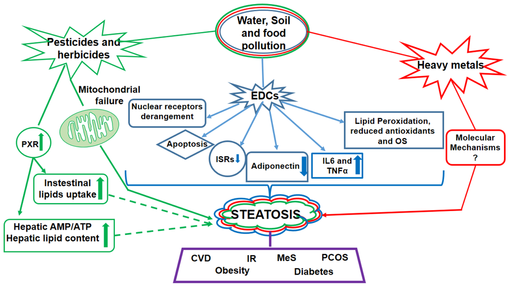 Several water, soil and food contaminants may alter metabolism through different mechanisms of action. Widely used pesticides and herbicides promote the occurrence of hepatic steatosis. To date, one potential mechanism underlying this pathological process involves the activation of the nuclear receptor PXR, which is known to promote the hepatic increase in AMP/ATP ratio and lipid content, as well as to upregulate intestinal lipids uptake (dashed lines indicate the hypothetical mechanism induced by pesticides). Pesticides and herbicides may also induce steatosis, obesity and IR by causing mitochondrial failure. Various studies reported the association of a high exposure to heavy metals (e.g., arsenic, lead, mercury and cadmium) to the incidence of NAFLD, obesity and diabetes, even though the exact mechanisms involved have not yet been elucidated. One of the most important classes of contaminants involved in a wide range of metabolic diseases is represented by the chemical compounds called EDCs. These molecules promote OS and related damage, such as lipid peroxidation, and reduce antioxidant defenses. Another consequence of the EDCs exposure is the onset of a pro-inflammatory state that modulates the expression of specific cytokines and adipokines. In fact, IL6 and TNFα were found to be higher in exposed subjects, whereas adiponectin was reduced. Strictly associated to EDCs, is the downregulation of ISRs and the occurrence of IR. At cellular and molecular levels, however, these molecules are known to induce hepatocellular apoptosis and to bind nuclear receptors (e.g., RXRs and PPARs), thus affecting their activities. This broad range of actions implies their involvement in the onset of several metabolic disorders, such as: diabetes, steatosis, obesity, MetS, PCOS and CVD. PXR: pregnane X receptor; IR: insulin resistance; ALT: alanine transaminase; EDCs: endocrine disruptor compounds; OS: oxidative stress; IL6: interleuchin 6; TNFα: tumor necrosis factor α; ISRs: insulin receptors; RXRs: retinoid X receptors; PPARs: peroxisome proliferator-activated receptors; MeS: metabolic syndrome; PCOS: polycystic ovary syndrome; CVD: cardiovascular disease.