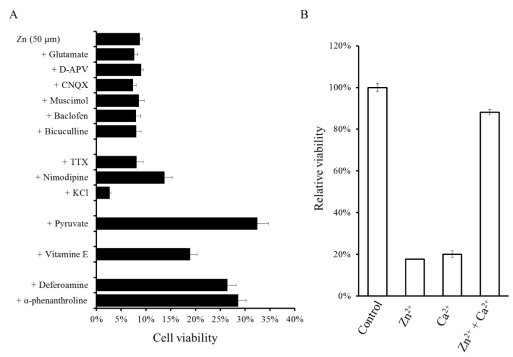 The co-exposure of GT1–7 cells to various metal ions with Zn has shown the involvement of other metal ions in Zn neurotoxicity [40]. The equivalent molar addition of Al3+ and Gd3+ significantly inhibited Zn-induced neuronal death. Moreover, the overloading of Ca2+ and Mg2+ inhibited the Zn-induced death of GT1–7 cells, and Zn protected GT1–7 cells from the neurotoxicity induced by Ca2+ overload and vice versa (Figure 3B).