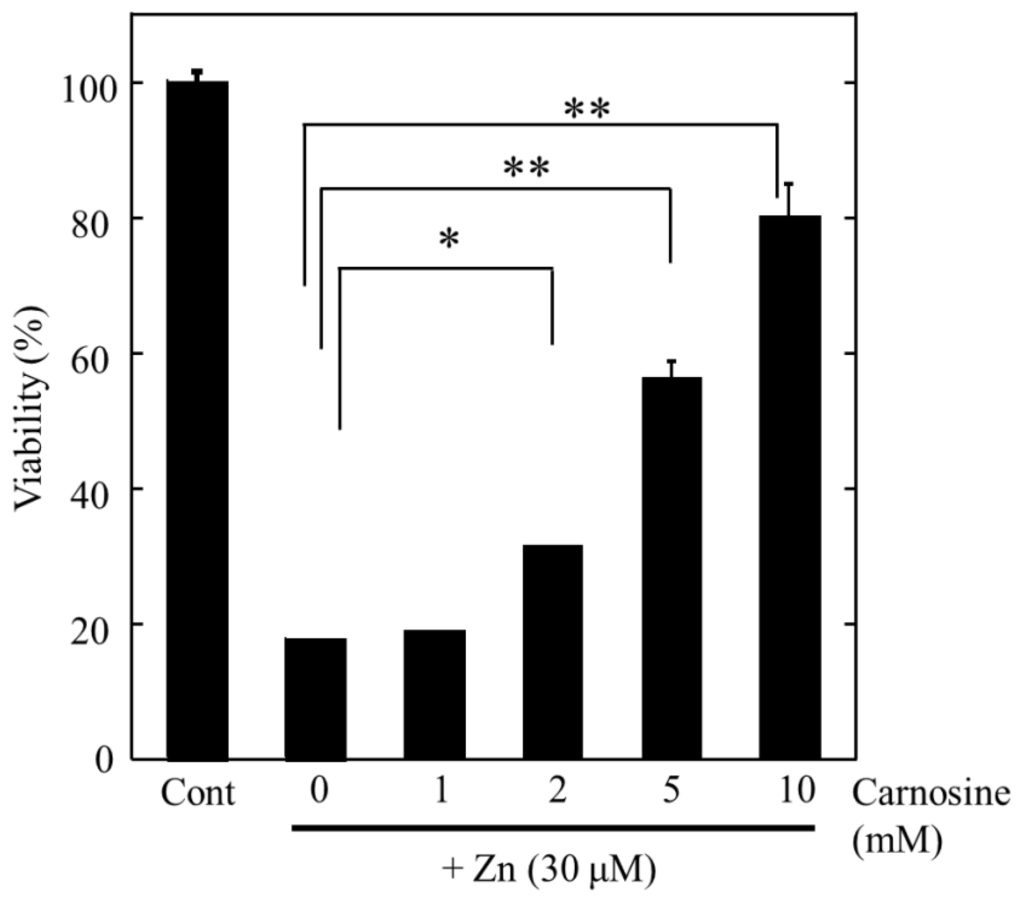 Considering the implication of Zn in transient global ischemia, substances that protect against Zn-induced neuronal death could be potential candidates for the prevention or treatment of neurodegeneration following ischemia and ultimately provide a lead for treatments for VD. We examined the potential inhibitory effects of various agricultural products, such as vegetable extracts, fruits extracts, and fish extracts, and found that extracts from eel muscles significantly protected against Zn-induced neurotoxicity [9]. Finally, we determined that carnosine, a small hydrophilic peptide abundant in eel muscles, protected GT1–7 cells from Zn-induced neurotoxicity in a dose-dependent manner (Figure 4).