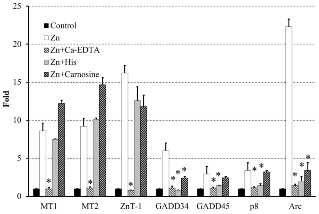 The coexistence of Ca-EDTA abolished the effects of Zn in the expression of these genes (see Zn + Ca-EDTA in Figure 5). Meanwhile, the addition of carnosine and histidine (His) did not influence the upregulation of MT1, MT2, or ZnT-1 during Zn-induced neurotoxicity (see Zn + Carnosine, Zn + His in Figure 5). However, the coexposure of GT1–7 cells to carnosine and His with Zn inhibited the expression of GADD34, GADD45, p8 and Arc induced by Zn exposure (Figure 5). These attenuations of carnosine and His on the Zn-induced expression of these genes may affect ER stress-related or Arc-related apoptotic pathways.