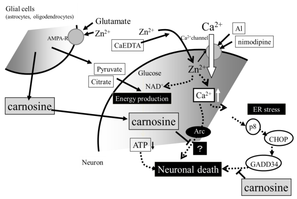 Hypothetical schematic of the molecular mechanisms of the protective effects of carnosine in preventing the neuronal death induced by Zn. Carnosine is synthesized in glial cells and is secreted in response to stimulation by glutamate and Zn; it protects neurons from Zn neurotoxicity. Carnosine inhibits the expression of ER stress-related genes and Arc, which are induced by Zn exposure. It is plausible that carnosine may be transported into cell bodies, where it can inhibit ER stress-related and/or Arc-related apoptotic pathways activated by Zn.