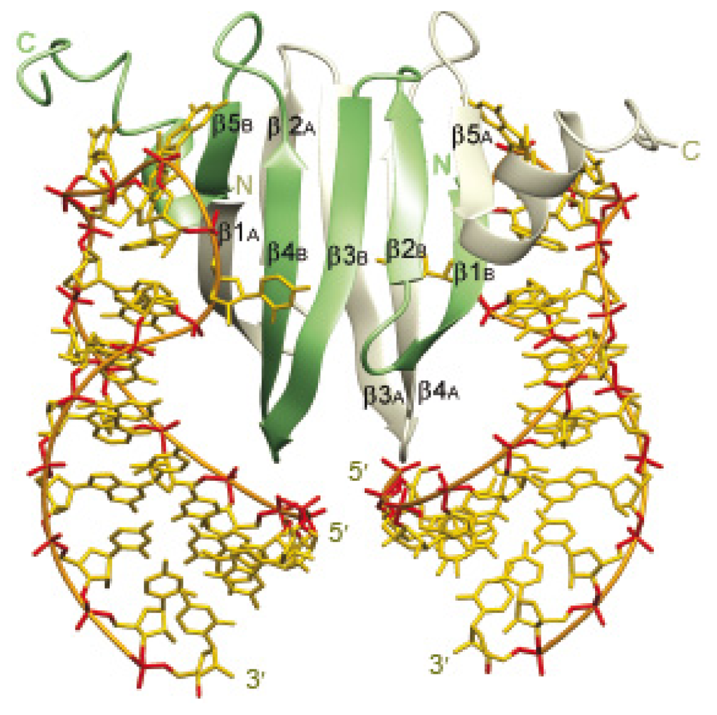 Structure of the RsmE-RNA complex of P. fluorescens. Solution structure of the 2:2 complex of RsmE with 20-nucleotide hcnA sequence. Protein ribbons belonging to each monomer are shown in green and grey. Heavy atoms of the two RNAs are shown in yellow (carbon and nitrogen) and red (oxygen and phosphorus). The linking phosphates are shown in orange. From [42].