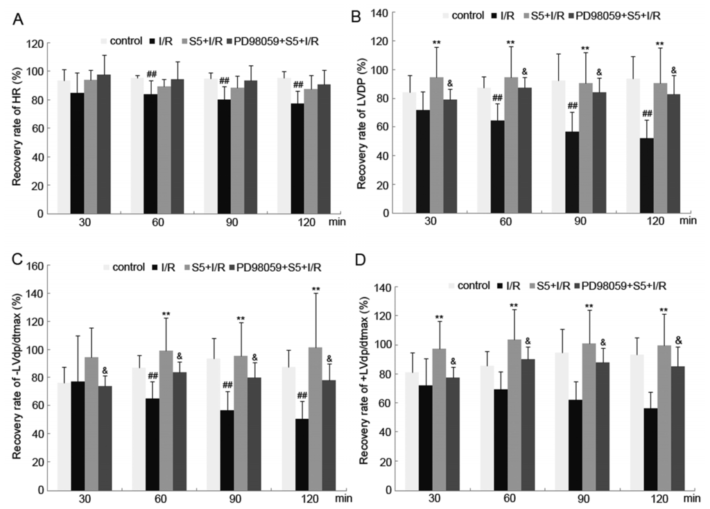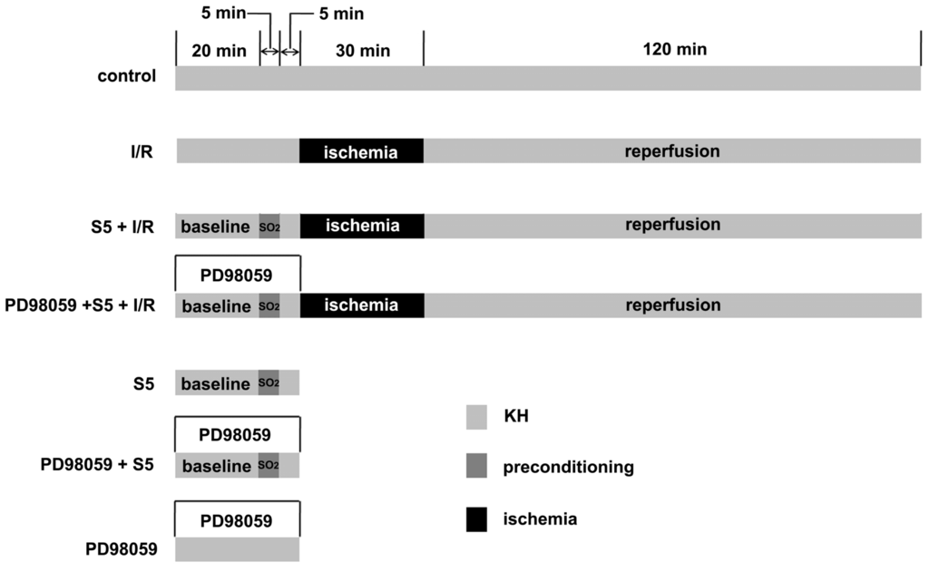 2.4. SO2 Preconditioning Improved the Myocardial Function in Isolated Perfused Rat Heart Subjected to Ischemia/Reperfusion, Which Could Be Abolished by Treatment with PD98059