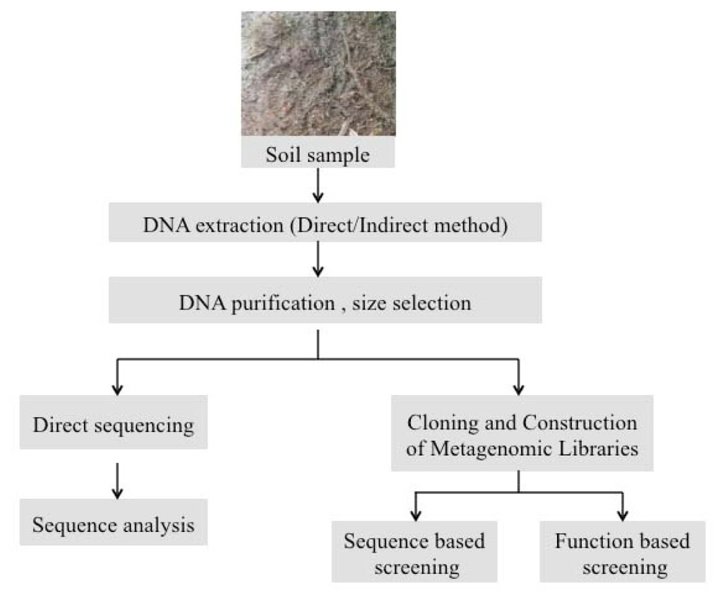 Surface-adherent microbial communities (biofilms) are a common feature of microbial growth in many environments [10] including soils. In the investigation of a soil biofilm it may be of particular interest to look at specific sections that may indicate a multitude of interactions between microbial populations in the biofilm. Visualization and imaging using microscopy techniques can be used to target this subset of the entire microbial population from the sample biofilm. There are two methods for the extraction and processing of metagenomic DNA from a microbial population, direct and indirect extraction. In the direct extraction method pioneered by Ogram et al. [11], any extracellular DNA is first separated from the environmental sample by treating it with an alkaline buffer. The cells in the matrix are then subjected to direct mechanical (e.g., bead beating) lysis followed by extraction of DNA released from these cells. DNA recovered by centrifugation is then concentrated and purified before cloning. In contrast, the indirect method involves recovery of microbial cells from the sample. The recovered cells are subjected to cell lysis (chemical and enzymatic) followed by DNA extraction and purification [12]. Although time-consuming the indirect extraction method prevents the contamination from non-bacterial DNA [13] that may be present in the sample. Direct extraction methods provide high yield of lower size DNA fragments whereas indirect methods provide low yield of higher size DNA fragments. Both methods have distinct advantages and limitations, and the choice should be based on the intended downstream application and the objective of the study. Irrespective of the DNA extraction method, care must be taken to avoid co-isolation of organic compounds that may be present in the sample and can inhibit downstream processes. Various factors to be considered pertaining to soil metagenomics and the use of specific strategies based on the ultimate goal of the study are discussed by Kakirde et al. [14] and this provides a good guideline for designing a metagenomics project. Since there are multiple approaches that can be adopted at each stage of a metagenomic analysis it is important to select appropriate DNA extraction and purification methods and consider if cloning is necessary.