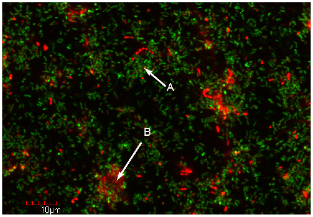 Biofilm enrichment strategy for metagenomics investigation. Confocal microscopy examination of a mixed population biofilm of E. coli and P. aeruginosa stained with the Live/Dead™ stain (Life Technologies, Grand Island, NY, USA) reveals microcolonies with viable (A) and non-viable (B) cells. Sampling and metagenomics analyses from these two microcolonies could suggest mechanisms underlying the loss of viability or other cellular interactions. While conventional genetic analyses can be performed for a mixed population biofilm containing known, genetically tractable organisms such as E. coli and P. aeruginosa [62], it is not practical for many naturally occurring biofilms with potentially unculturable organisms. This combination biofilm-enrichment strategy for metagenomics would be particularly useful in natural biofilms wherein the component populations may not be known.