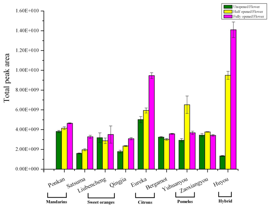 The changes in total volatile amount in different citrus flowers during blooming are shown in Figure 1. For flowers at the fully opened stage, Huyou produced the highest amounts, followed by lemon, while the rest were similar to each other. On the whole, fully opened flowers had a higher volatile amount than other stages, this is especially obvious for Huyou and lemon (Figure 1). This observation could indicate that during full blooming, the increased emission of volatiles might be helpful for attracting pollination agents. Flower volatiles have been infrequently studied in citrus previously, Jabalpurwala et al. reported that pomelo produced the highest total level of volatiles followed by grapefruit, sweet orange, mandarin and the lowest in lime [24]. With different cultivars in this study, we observed that Huyou produced an even higher amount of flower volatiles than the two pomelos tested. Huyou is a natural citrus hybrid, with parents tentatively identified as pomelo and sour orange [40], originating in Changshan county of Zhejiang province. Furthermore, the total ion profile from GC-MS and volatile fingerprints obtained from electronic nose emitted from different cultivars during development also changed quite significantly flower stages and citrus types (Figure S1).