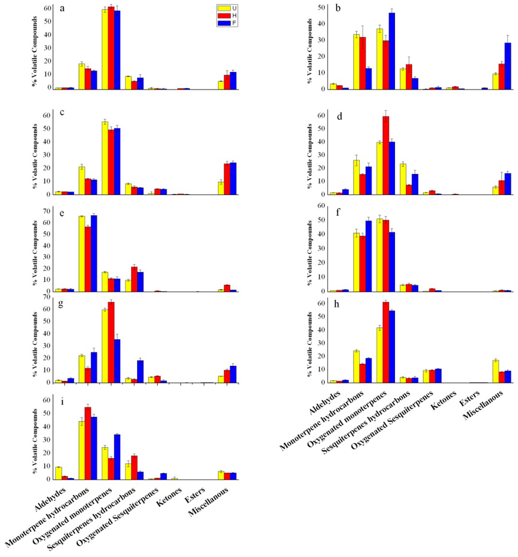 Evolution of each group of flower volatile compounds during blooming in the Ponkan (a); Satsuma (b); Qingjia (c); Liubencheng (d); Eureka (e); Bergamot (f); Yuhuanyou (g); Zaoxiangyou (h); and Huyou (i); Citrus flowers were sampled at unopened flower “U”, half opened “H”, and fully opened flower “F” blooming stages.