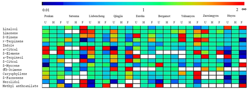 Ratio of major flower volatiles in either unopened (U) or fully opened (F) to half opened (H) flowers from nine citrus cultivars. Color code shown above the figure: red shows high, blue low. The blank cells indicate volatiles that were absent.
