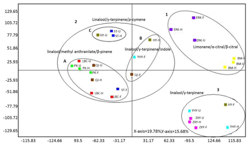 Principle component analysis (PCA) of flower volatiles from nine citrus cultivars during blooming (abbreviated names of cultivars are presented in Table 1; each color represents one cultivar; while U, H and F represents unopened, half opened and fully opened flower stages). Note: each subgroup exhibited abundant volatiles.