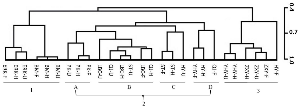 Hierarchical cluster analysis based on flower volatiles during blooming for nine cultivars (abbreviated names of cultivars are as in Table 1, and 1 to 3 represent different cluster groups; while U represents unopened; H: half opened and F: fully opened flower blooming stages). Group 1 represented the citron, group 2 comprised four subgroups (2A Ponkan, 2B sweet orange and Satsuma mandarin, and 2C Satsuma mandarin and Huyou, and 2D Yuhuanyou, Huyou and Qingjia), while group 3 represented pomelo and Huyou.