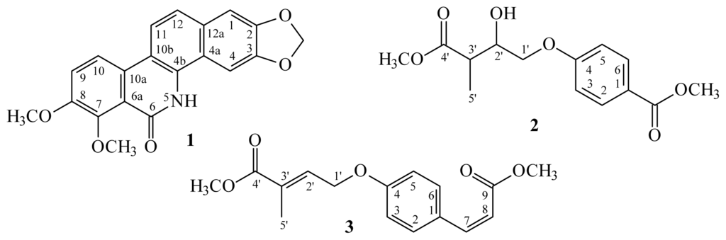 In our studies of Formosan plants for in vitro anti-inflammatory activity, Z. ailanthoides was found to be an active species. The MeOH extract of the twigs of Z. ailanthoides showed potent inhibitory effects on superoxide anion generation and elastase release by human neutrophils in response to formyl-l-methionyl-l-leucyl-l-phenylalanine/cytochalasin B (fMLP/CB). Figure 1 illustrates the structures of a new benzo[c]phenanthridine, oxynorchelerythrine (1) and two new benzenoid derivatives, methyl 4-(2-hydroxy-4-methoxy-3-methyl-4-oxobutoxy)benzoate (2) and (E)-methyl 4-(4-((Z)-3-methoxy-3-oxoprop-1-enyl)phenoxy)-2-methylbut-2-enoate (3). Eleven known compounds (4–14), have been isolated and identified from the twigs of Z. ailanthoides and their structures are depicted in Figure 2.