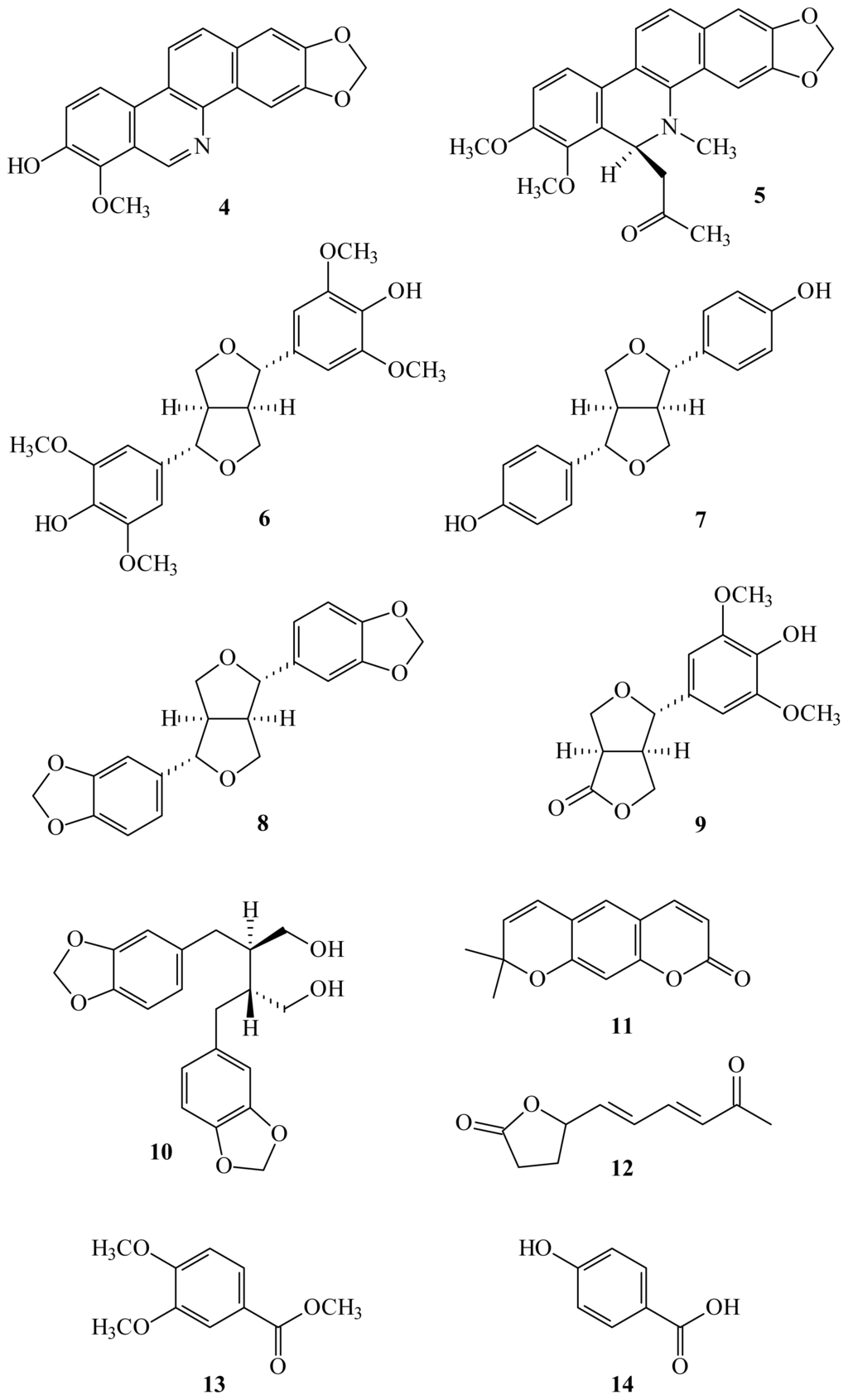 The known isolates were readily identified by a comparison of physical and spectroscopic data (UV, IR, 1H-NMR, [α]D, and MS) with corresponding authentic samples or literature values, and this included two benzo[c]phenanthridines, decarine (4) [16] and 6-acetonyldihydrochelerythrine (5) [17], five lignan derivatives, (−)-syringaresinol (6) [18], 5′,5″-didemethoxypinoresinol (7) [19], (+)-episesamin (8) [12], glaberide I (9) [20], and (−)-dihydrocubebin (10) [21], a coumarin, xanthyletin (11) [12], a lactone, lanyulactone (12) [22], and two benzenoids, methyl 3,4-dimethoxybenzoate (13) [23] and p-hydroxybenzoic acid (14) [24].