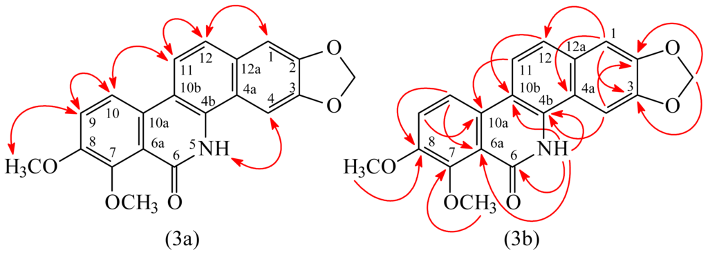 Oxynorchelerythrine (1) was isolated as a white amorphous powder. Its molecular formula, C20H15NO5, was determined on the basis of the quasi-molecular ion at m/z 372.0846 ([M + Na]+, calcd for C20H15NO5Na: 372.0848) in the HR-ESI-MS spectrum (positive-ion mode) (Figures S1 and S2) and was supported by the 1H-, 13C-, and DEPT NMR data. The UV absorptions of 1 at 236, 281, and 286 nm were similar to those of oxychelerythrine [13], and suggested the presence of a 2,3,7,8-tetraoxygenated benzo[c]phenanthridin-6-one skeleton. The presence of carbonyl group was revealed by the band at 1644 cm−1 in the IR spectrum, which was confirmed by the resonance at δC 162.4 in the 13C-NMR spectrum. The IR of 1 also showed the NH absorption at 3218 cm−1 and the methylenedioxy bands at 1040, 938 cm−1. The 1H-NMR spectrum of 1 showed the resonances for six aromatic protons [δH 7.20 (1H, s, H-1), 7.43 (1H, br s, H-4), 7.46 (1H, d, J = 9.0 Hz, H-9), 7.51 (1H, br d, J = 9.0 Hz, H-12), 8.02 (1H, d, J = 9.0 Hz, H-11), 8.09 (1H, d, J = 9.0 Hz, H-10), two methoxy groups [δH 4.01 (3H, s, OMe-8), 4.05 (3H, s, OMe-7)], a methylenedioxy group [δH 6.13 (2H, s, OCH2O-2,3)], and an NH group [δH 9.14 (1H, br s, D2O exchangeable, NH)]. Comparison of the 1H- and 13C-NMR data (Table 1) (Figures S3 and S4) of 1 with those of oxychelerythrine [14] suggested that their structures are closely related, except that the NH group (δH 9.14) of 1 replaced the N-Me group [δH 3.89 (3H, s)] of oxychelerythrine [14]. This was supported by HMBC correlations between NH (δH 9.14) and C-4b (δC 135.6), C-6 (δC 162.4), C-6a (δC 119.7), and C-10b (δC 128.9) and NOESY correlations between NH (δH 9.14) and H-4 (δH 7.43). The full assignment of 1H- and 13C-NMR resonances was supported by 1H–1H COSY, DEPT, HSQC, NOESY (Figure 3), and HMBC (Figure 3) spectral analyses. On the basis of the above data, the structure of 1 was elucidated as oxynorchelerythrine.