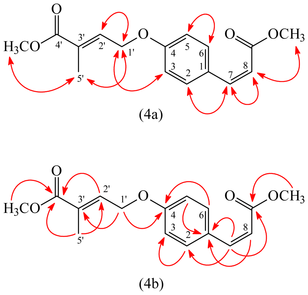 (E)-Methyl 4-(4-((Z)-3-methoxy-3-oxoprop-1-enyl)phenoxy)-2-methylbut-2-enoate (3) was isolated as an amorphous powder. The molecular formula C16H18O5 was deduced from a sodium adduct ion at m/z 313.1055 [M + Na]+ (calcd 313.1052) in the HR-ESI mass spectrum (Figures S9 and S10). The presence of carbonyl groups was revealed by the band at 1715 cm−1 in the IR spectrum, which was confirmed by the resonances at δ 166.9 and 167.8 in the 13C-NMR spectrum. The 1H- and 13C-NMR data (Figures S11 and S12) of 3 were similar to those of (E)-methyl 4-(4-(3-hydroxypropyl)phenoxy)-2-methylbut-2-enoate [12], except that the (Z)-3-methoxy-3-oxoprop-1-enyl group [δH 3.73 (3H, s, OMe-9), 5.83 (1H, d, J = 12.4 Hz, H-8), 6.86 (1H, d, J = 12.4 Hz, H-7); δC 51.3 (OMe-9), 116.7 (C-8), 143.6 (C-7), 166.9 (C-9)] at C-1 of 3 replaced 3-hydroxypropyl group of (E)-methyl 4-(4-(3-hydroxypropyl)phenoxy)-2-methylbut-2-enoate [12]. This was supported by (i) the HMBC correlations (Figure 4) between between H-7 (δH 6.86) and C-1 (δC 127.3), C-2 (δC 132.2), C-6 (δC 132.2), and C-9 (δC 166.9); (ii) the NOESY correlation (Figure 4) between H-7 (δH 6.86) and H-2 (δH 7.69) and H-8 (δH 5.83); and (iii) the cis-coupling constant (J = 12.4 Hz) for H-7 and H-8 of 3. The NOESY correlations between H-1′ (δH 4.69) and H-5′ (δH 1.93) suggested 2′E-configuration of 3. The structure elucidation of 3 was supported by 1H–1H COSY and NOESY (Figure 4) experiments, and 13C NMR assignments were confirmed by DEPT, HSQC, and HMBC (Figure 4) techniques.