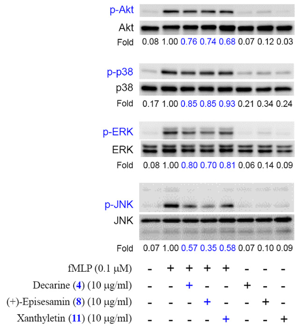 Compounds 4, 8, and 11 inhibit the phosphorylation of MAPKs and Akt in fMLP-activated neutrophils. Cells were treated with 4, 8, and 10 (10 μg/mL) for 5 min, and then stimulated with fMLP for 30 s. Phosphorylation of MAPKs and Akt was analyzed by immunoblotting. Densitometric analysis of all samples was normalized to the corresponding total protein.