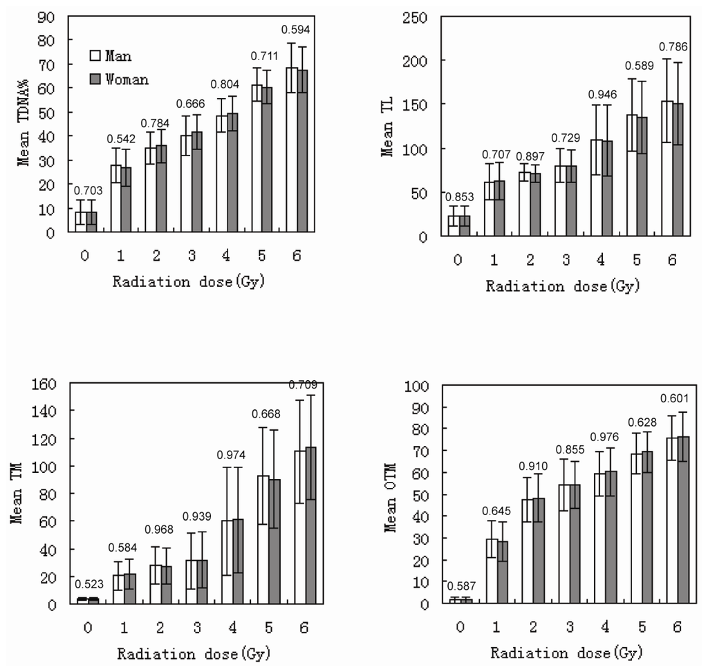 Variations in tail DNA (TDNA)%, tail length (TL), tail moment (TM), and olive tail moment (OTM) between male and female donors (the numbers above the column diagrams are p values between the male and female groups; error bars: ±1.00 SD).