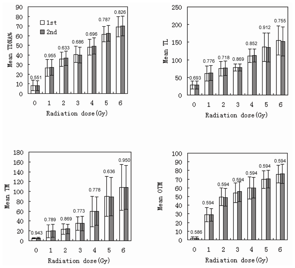Variations in TDNA%, TL, TM, and OTM between the first and second experiments (the numbers above the column diagrams are p values between the first and second experiments; error bars: ±1.00 SD).