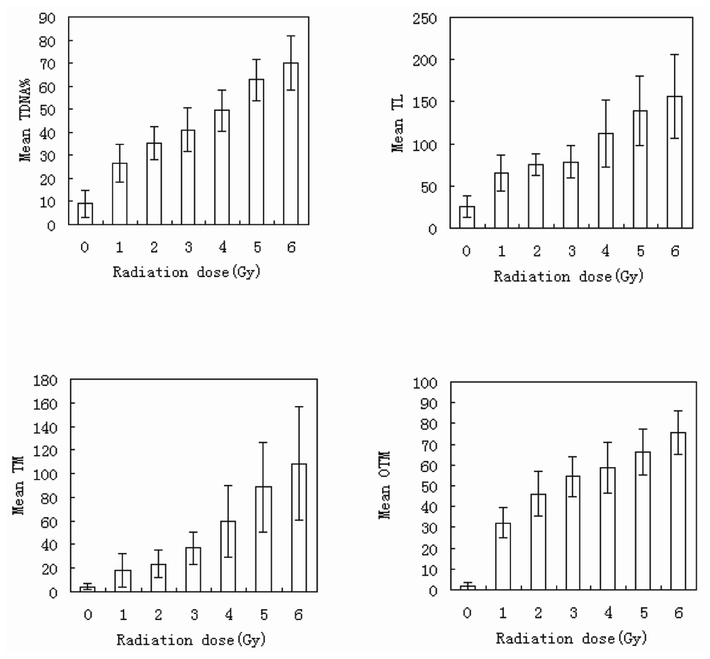The column diagrams and error bars for TDNA%, TL, TM, and OTM detected immediately after irradiation by the comet assay (error bars: ±1.00 SD).
