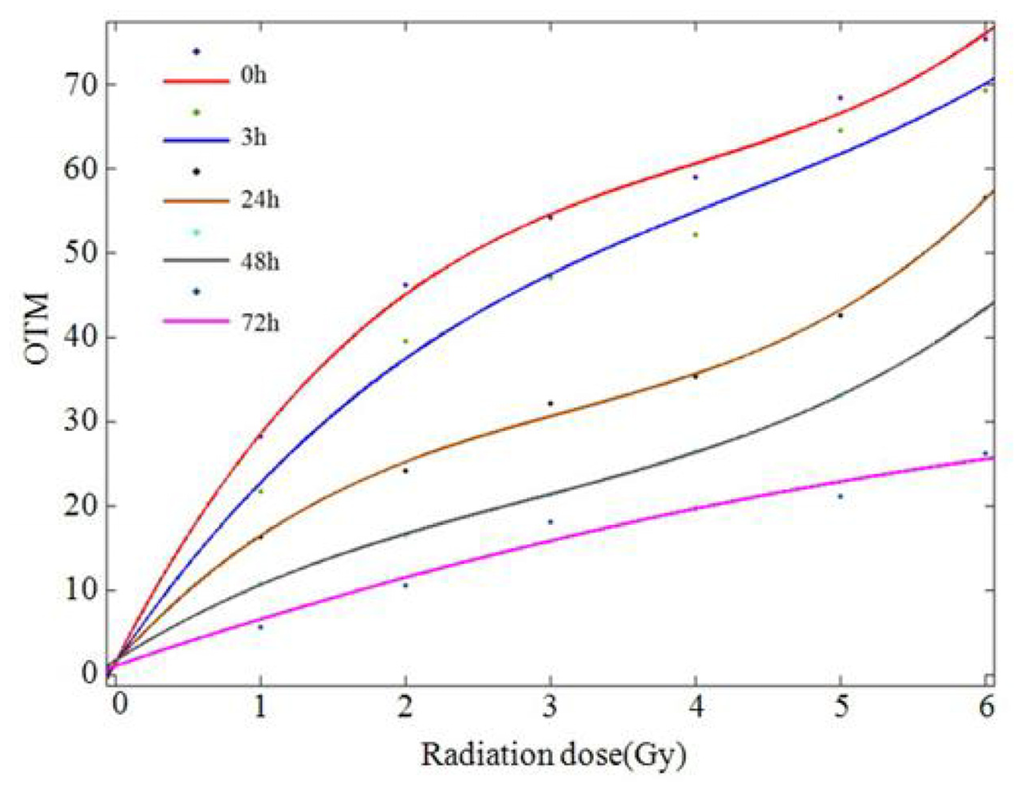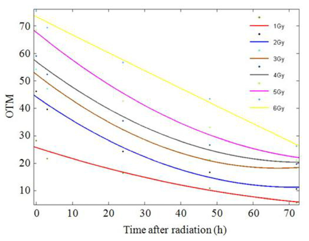 Time-response curves of OTM obtained from the comet assay within 72 h after irradiation. [Time-effect equations for different radiation doses are shown below: “y” is the observed value of OTM; “x” is the time after irradiation (h)]. Fit 1: y1Gy = 0.002119x2 − 0.4259x + 25.73 (R2 = 0.9537, p = 0.000); Fit 2: y2Gy = 0.006418x2 − 0.918x + 44.1 (R2 = 0.9847, p = 0.000); Fit 3: y3Gy = 0.007615x2 − 1.019x + 52.29 (R2 = 0.9914, p = 0.000); Fit 4: y4Gy = 0.006759x2 − 0.9946x + 56.95 (R2 = 0.9879, p = 0.000); Fit 5: y5Gy = 0.006077x2 − 1.069x + 67.62 (R2 = 0.9896, p = 0.000); Fit 6: y6Gy = 0.0001785x2 − 0.6587x + 73.31 (R2 = 0.9928, p = 0.000).