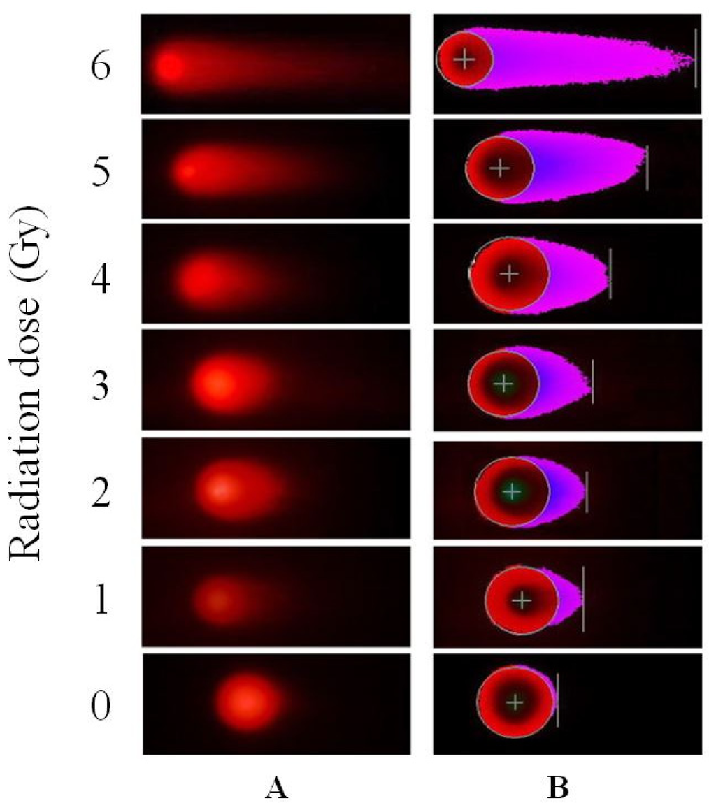 Comet images of lymphocytes after irradiation by γ-rays. (A): Original comet images; and (B): Comet images analyzed by CASP (CASP, Wroclaw, Poland).