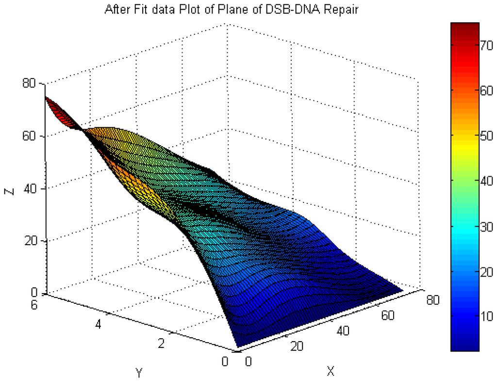A paired-samples t test was used to compare the differences in DNA DSBs between the in vivo and in vitro groups. Statistical analyses were performed using one-way analysis of variance (ANOVA), and significance was assumed if p < 0.05. Matlab software, version 7.8 (MathWorks, Natick, MA, USA), was used to fit the dose- and time-response (repair) curves, and the two curves were then combined to design the three-dimensional plane model using the 3D difference calculation performed using the least squares method.